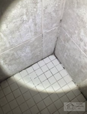 Early-Stage Surface Mold – Initial mold growth along tile and grout caused by high humidity.